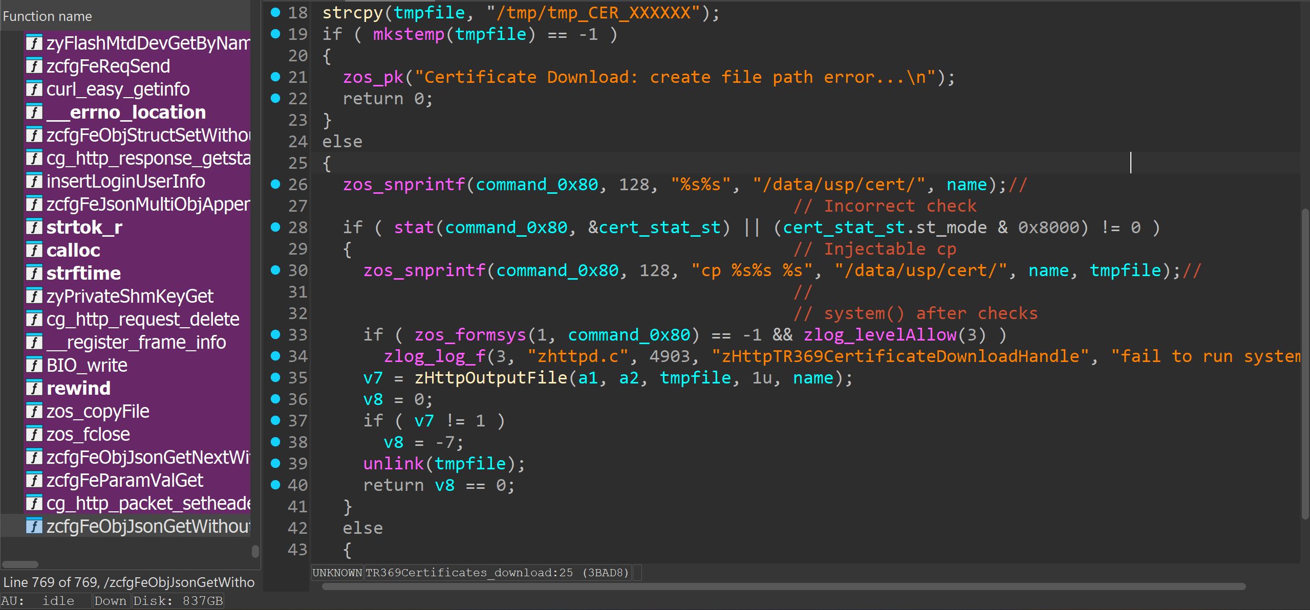 In the /cgi-bin/TR369Certificates?action=download endpoint I found the following within zhttpd. It’s nothing to do with “priv” parameter, but I noticed it is vulnerable.